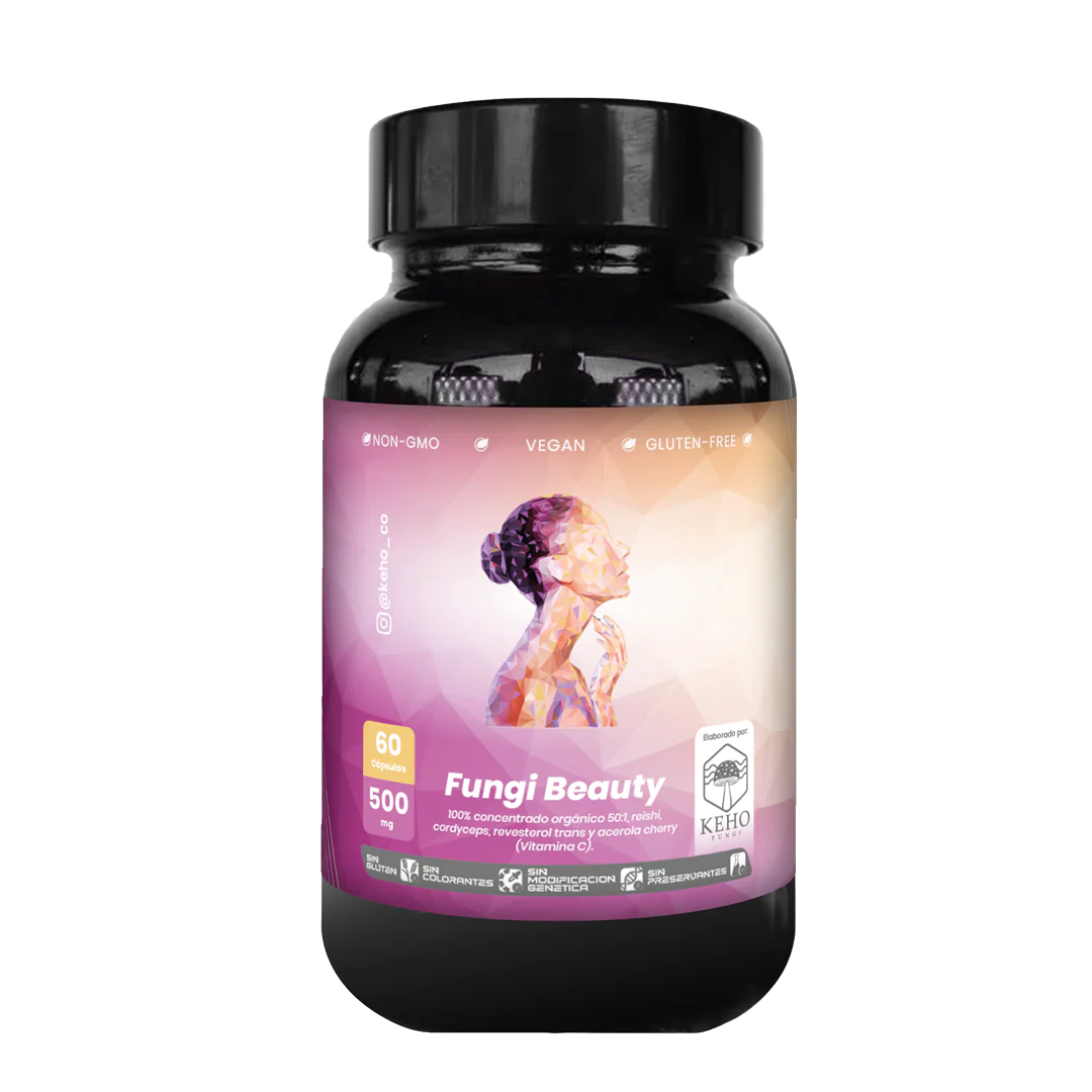 Fungi Beauty de Keho ofrece una combinación de hongos medicinales y antioxidantes (extractos de Cordyceps Sinensis, Reishi, plus vitamina C natural vía Acerola Cherry y resveratrol), pensado para mejorar la salud y apariencia de la piel, uñas y cabello, apoyando regeneración celular, hidratación, nutrición y una apariencia más saludable.
