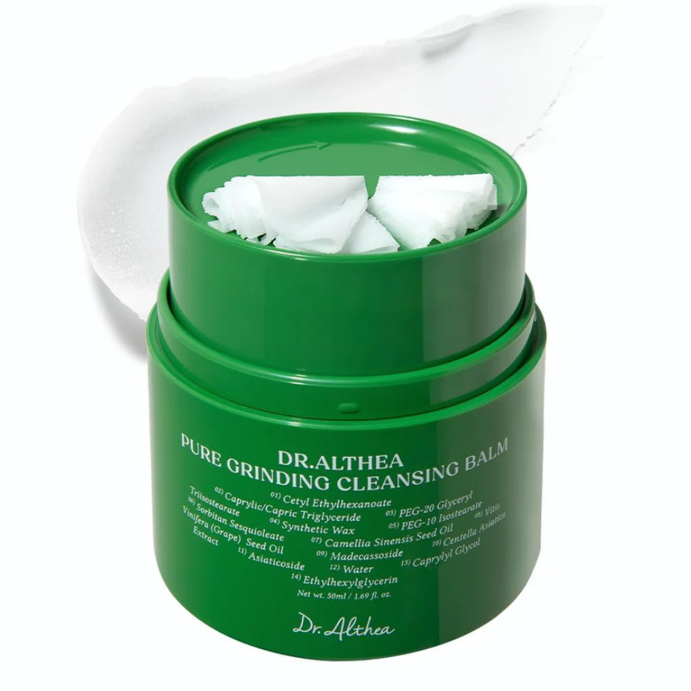 El Pure Grinding Cleansing Balm de Dr. Althea elimina maquillaje, protector solar e impurezas sin irritar la piel 💫. Enriquecido con aceites naturales, ceramidas y pantenol, disuelve eficazmente los residuos mientras mantiene la hidratación y refuerza la barrera cutánea. Deja la piel limpia, flexible y luminosa ✨.